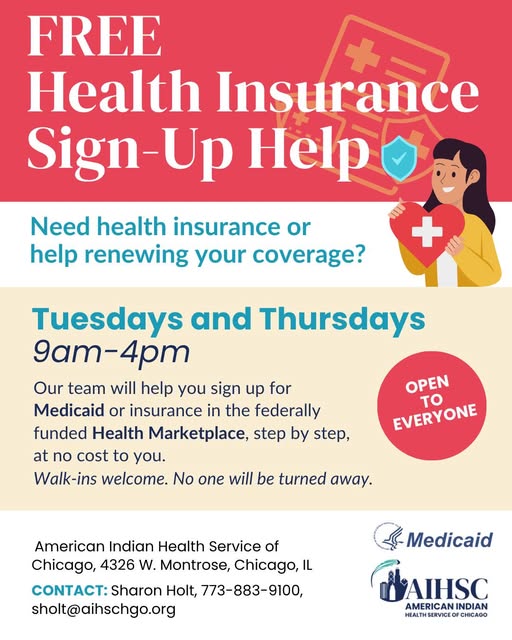 Topic: For Seniors: Be sure to reach out to Sharon Holt at American Indian Health Service of Chicago for FREE help signing up for health insurance.